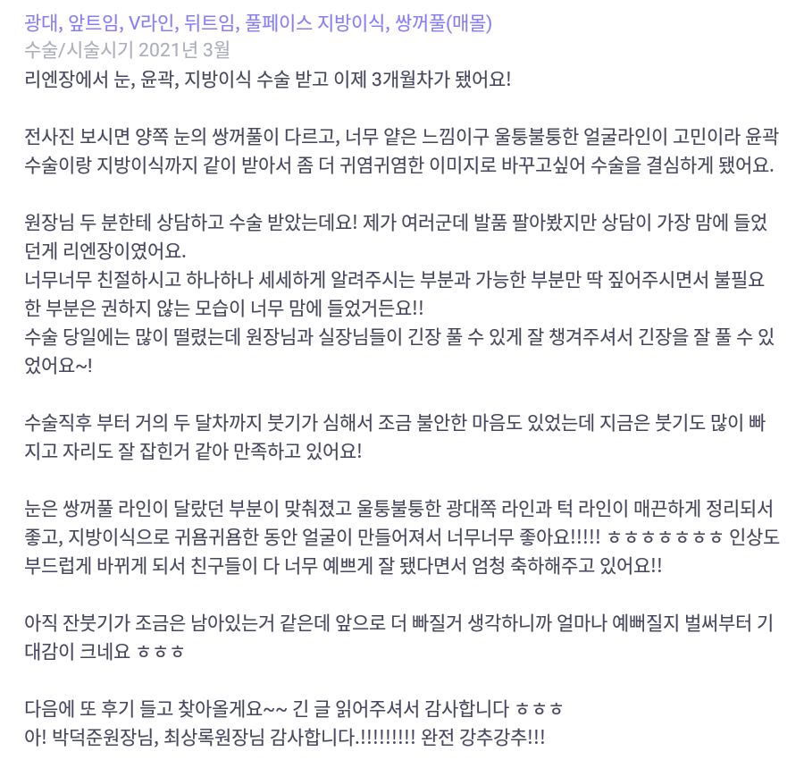 リエンジャン美容外科医院 ★★★★★ 5.0 [바비톡] 지방이식, 안면윤곽, 쌍꺼풀 / 3개월차/ 닉네임:우아어아아아 匿***@ | 2022.01.11 | 15 리엔장성형외과에서 수술 받은 후 강남언니에 업로드한 실제 후기입니다. 수술항목: 윤곽 3종, 쌍꺼풀(매몰), 풀페이스 지방이식 口コミ一覧に戻る