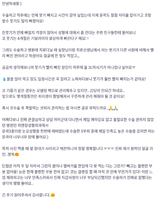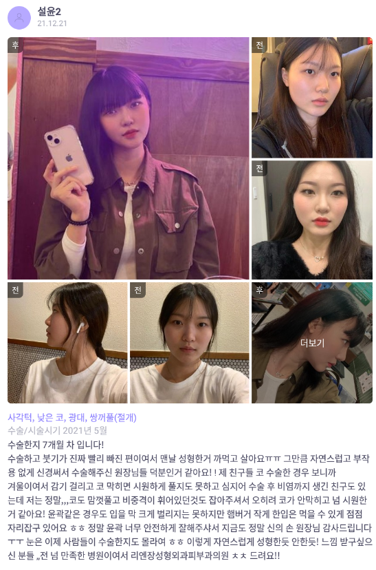 リエンジャン美容外科医院 ★★★★★ 5.0 [바비톡] 안면윤곽, 쌍꺼풀, 코성형 / 7개월차 / 닉네임 : 설윤2 匿***@ | 2022.01.18 | 21 리엔장성형외과에서 수술 받은 후 바비톡에 업로드한 실제 후기입니다.수술항목: 광대축소, 사각턱축소, 턱끝성형, 쌍꺼풀(절개), 코성형 口コミ一覧に戻る
