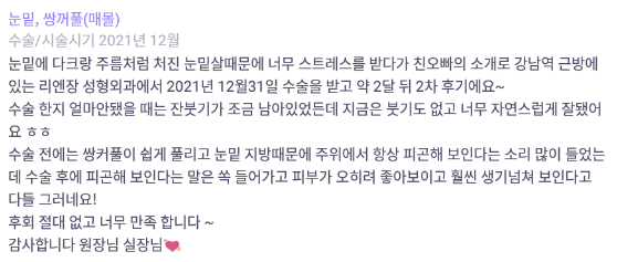 リエンジャン美容外科医院 ★★★★★ 5.0 [바비톡] 눈밑, 쌍꺼풀(매몰) / 2개월차 / 닉네임 : 언이어니언디 匿***@ | 2022.03.15 | 17 口コミ一覧に戻る