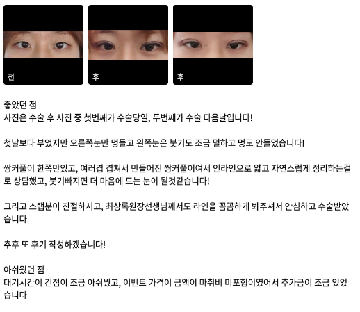 リエンジャン美容外科医院 ★★★★★ 5.0 [강남언니] 자연유착 / 1개월차 / 닉네임 : ㅋㄱㅋㅋㄲ 匿***@ | 2022.03.15 | 19 口コミ一覧に戻る