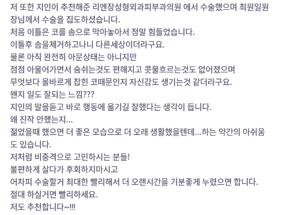 リエンジャン美容外科医院 ★★★★★ 5.0 [바비톡] 코성형 / 1개월차/ 닉네임:슈퍼츄 匿***@ | 2022.10.24 | 17 口コミ一覧に戻る