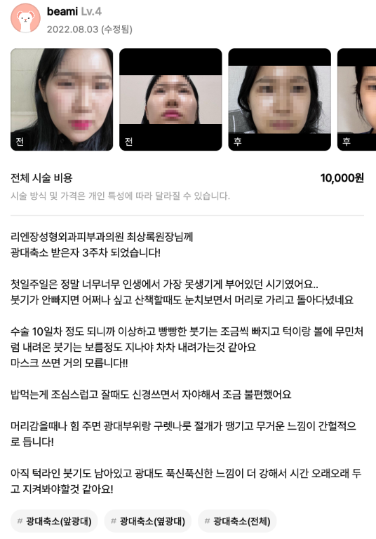 リエンジャン美容外科医院 ★★★★★ 5.0 [강남언니] 안면윤곽(광대) / 3주차/ 닉네임: beami 匿***@ | 2023.01.05 | 20 口コミ一覧に戻る